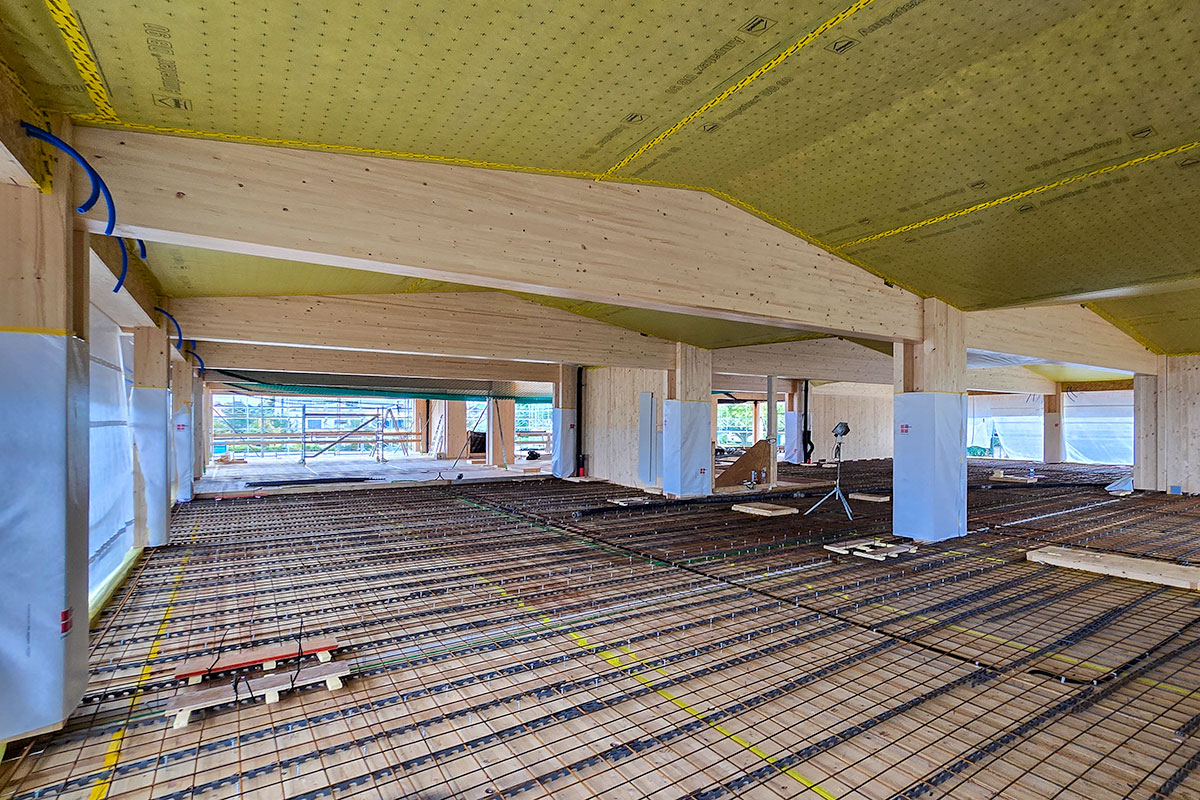 Im schaffhausischen Neunkirch entsteht eine Schulanlage mit Turnhalle und Schulgebäude. Die Dachträger des Schulgebäudes sind als durchlaufende Mehrfach-Satteldachträger ausgeführt. Zwischen den Trägern spannt ein gedämmtes Dachelement mit einer Indach-Photovoltaikanlage. Die Brettstapeldecken sind im Verbund mit dem Überbeton ausgeführt. Die blockverklebten Träger der Turnhalle haben eine Spannweite von 26.40 m und am höchsten Punkt eine Dimension von 320/2460 mm.