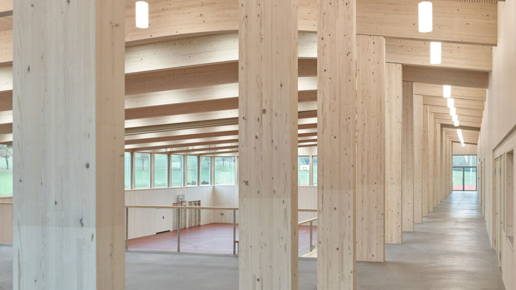 Die Statik sorgt für Freiraum, das Material für gute Atmosphäre. Neben dem denkmalgeschützten Schulhaus von 1908 entstand die Anlage aus Holz: ein dreistöckiges Schulhaus mit stützenfreiem Treppenhaus im Erdgeschoss mit Lastumleitung übers Dach sowie filigranen, weitgespannten Holz-Beton-Verbunddecken, ein eingeschossiger Kindergarten mit Satteldach auf tragenden Rahmenbauwänden sowie eine Doppelturnhalle mit sichtbarer Tragstruktur und Holzbekleidung.