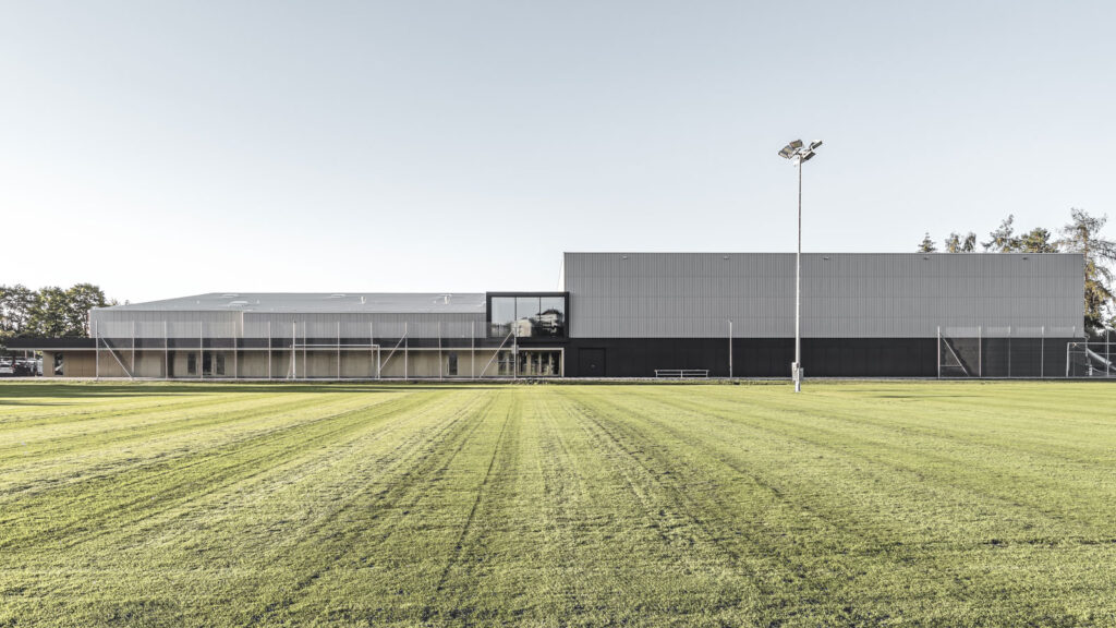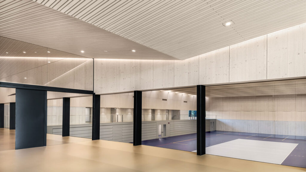 Amriswil wächst – auch in Bezug auf die Infrastruktur. Die Sportanlagen wurden schrittweise ausgebaut. Zuerst entstand eine neue Dreifachhalle mit einer Hülle aus Holzelementen, dann wurde die alte Turnhalle saniert. Das Tragwerk der Erweiterung besteht aus sichtbarem Brettschichtholz, die Spannweite beträgt aussergewöhnliche 33 Meter. Die 17 Dachbinder haben ein Volumen von 220 m3. In der abgehängten Lattendecke dazwischen verbirgt sich die Haustechnik.